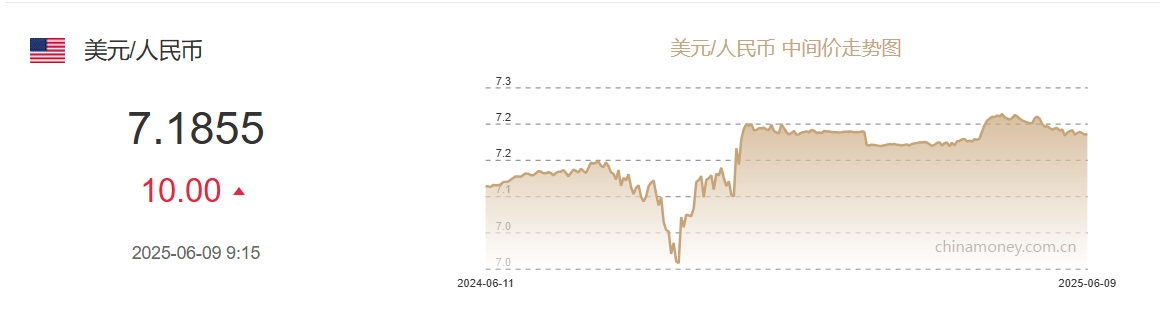 中新网6月9日电 据中国外汇交易中心网站消息涨8,中国人民银行授权中国外汇交易中心公布,2025年6月9日银行间外汇市场人民币汇率中间价为:1美元对人民币7.1855元,下调10个基点。