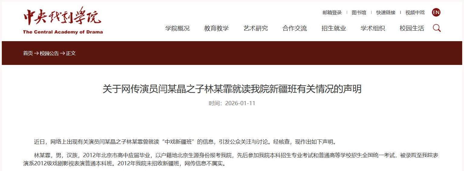 先把事情捋清楚:闫学晶在直播中谈到儿子林傲霏的收入情况,说拍一部戏也就几十万,还要承担家庭年支出百八十万,否则“家里转不动”。这段话本意可能是聊家常、聊压力,但它踩中了公众最敏感的点——“普通人对几十万的体感”和“明星家庭的生活方式”。于是,很多人第一反应不是理解,而是反感:你们挣得已经比大多数人多太多了,怎么还说得像很难?这种情绪一上来,讨论很容易从“钱”扩散成“价值观”。就在争议还在发酵时,另一个话题也被带了出来:林傲霏的中戏入学问题。闫学晶此前在直播里提过,儿子因高考分数不高,后来报考了中央戏剧学院“新疆班”并成功入学,这个说法引发了不少质疑。1月11日晚,中央戏剧学院发布声明回应:林某霏为汉族,2012年以北京生源身份报考并录取至表演系普通本科班;同时明确表示“2012年我院未招收新疆班”,相关网传信息不属实。