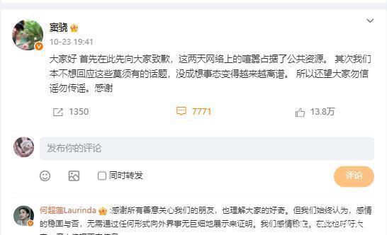 何超莲和窦骁的社交账号被各种揣测淹没,舆论压力向汹涌的潮水般向俩人涌来。 面对这些铺天盖地的传闻,窦骁率先发文否认婚变传闻,何超莲随机转发。