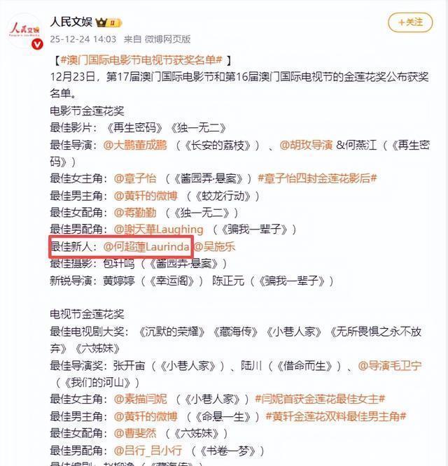 何超莲凭借该部影片一举斩获金莲花最佳新人奖。 千万可不要小瞧金莲花奖项的含金量。